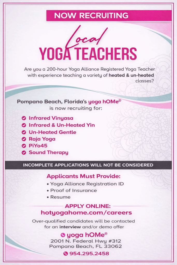 Pompano Beach, Florida’s yoga hOMe® is now recruiting yoga teachers for the following modalities: * Heated Vinyasa * Non-Heated Vinyasa * Gentle, Restorative & Yin * PiYo (Hot Pilates)